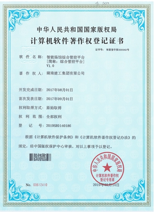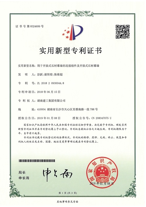 近日,经国家知识产权局、国家版权局审查,集团申报的“一种加劲肋装饰面板及其连接结构”“一种剪力墙止水结构及止水板固定装置”“用于开放式石材幕墙的连接组件及开放式石材幕墙”3项科技成果成功获得实用新型专利权;“智能场馆综合管控平台[简称:综合管控平台]V1.0”、“智能楼宇集控平台[简称:集控平台]V1.0”2项科技成果成功获得计算机软件著作权。