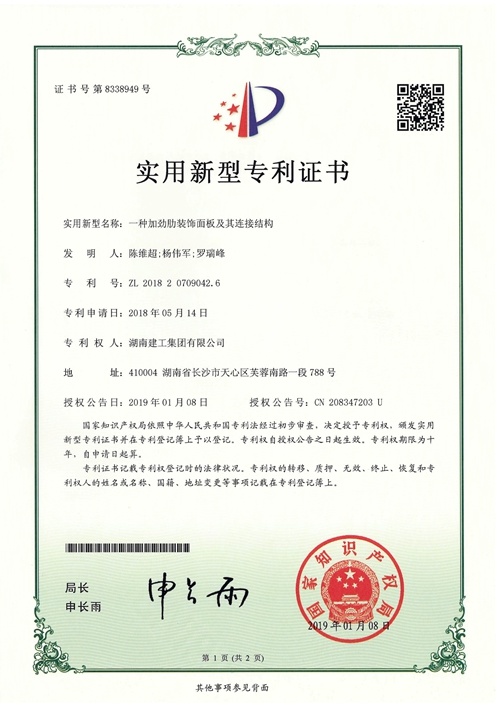 据了解,一种加劲肋装饰面板及其连接结构技术,通过在装饰面板上设置带凹槽的加劲肋,增强装饰面板的平面刚度,提高装饰面板的抗折性能,为装配式装饰面板与主体结构的连接提供了可靠、便捷的连接方式;一种剪力墙止水结构及止水板固定装置技术,通过增设支撑架,将止水板固定在支撑架上,并采用定位装置将支撑架定位在墙体的钢筋骨架上,提高了止水板的安装工效,避免了传统焊接固定工艺对止水板及墙体主筋的损伤;用于开放式石材幕墙的连接组件及开放式石材幕墙技术,采用特制横梁和挂件,使石材装饰面板呈一定倾斜角安装在主龙骨上,增强了石材幕墙的独特造型及美观,同时石材面板将雨水引流至石材背面,通过防水衬板与横梁组成的防水系统有效的疏导雨水,解决了传统石材幕墙雨水冲刷石材面板、密封胶造成面板污染及密封胶老化的问题。