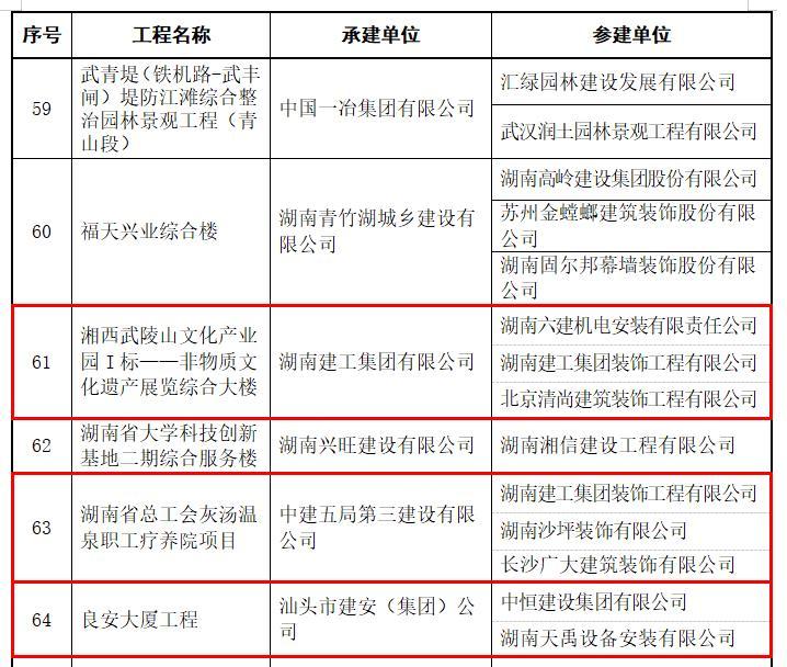 中国建设工程鲁班奖(国家优质工程)是中国建筑行业工程质量的最高荣誉,代表中国建筑行业质量最高水平,一直以来被誉为中国建筑界的“奥斯卡奖”,由住房和城乡建设部主管,中国建筑业协会组织评选,每年评选一次,两年颁奖一次,授予创建出一流工程的企业。此次湖南建工集团4个项目共获6项鲁班奖,其中湖南建工集团有限公司承建“湘西武陵山文化产业园I标——非物质文化遗产展览综合大楼”获1项,湖南六建机电安装有限责任公司参建“湘西武陵山文化产业园I标——非物质文化遗产展览综合大楼” 获1项,湖南建工集团装饰工程有限公司参建“湘西武陵山文化产业园I标——非物质文化遗产展览综合大楼” 获1项,湖南建工集团装饰工程有限公司参建“湖南省总工会灰汤温泉职工疗养院项目”获1项,湖南建工集团装饰工程有限公司参建“广深港客运专线深圳福田站”获1项,湖南五建天禹设备安装有限公司参建“良安大厦工程”获1项。