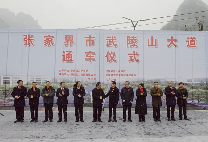 张家界武陵山大道是打通张家界市中心城区至武陵源核心景区旅游快车道的标志性工程,广大市民游客们翘首以盼,其特殊的旅游效益、经济效益备受各界关注。张家界市委、市政府主要领导多次莅临张家界武陵山大道项目施工现场,对项目建设给予大力支持;集团党委高度重视,周密部署,项目部全体工作人员更是鼓足干劲、跋山涉水、不畏艰辛,牢牢把握时间节点,努力克服征拆困难、交通干扰、山体陡峭无作业场地以及国家金融政策调整导致融资困难等不利因素,充分发挥“5+2”、“白加黑”的拼搏精神,在确保质量安全的前提下,高速度、严标准地建成了这条张家界建市以来单体投资最大的市政工程项目,彻底解决了广大市民游客“行路难”的问题。